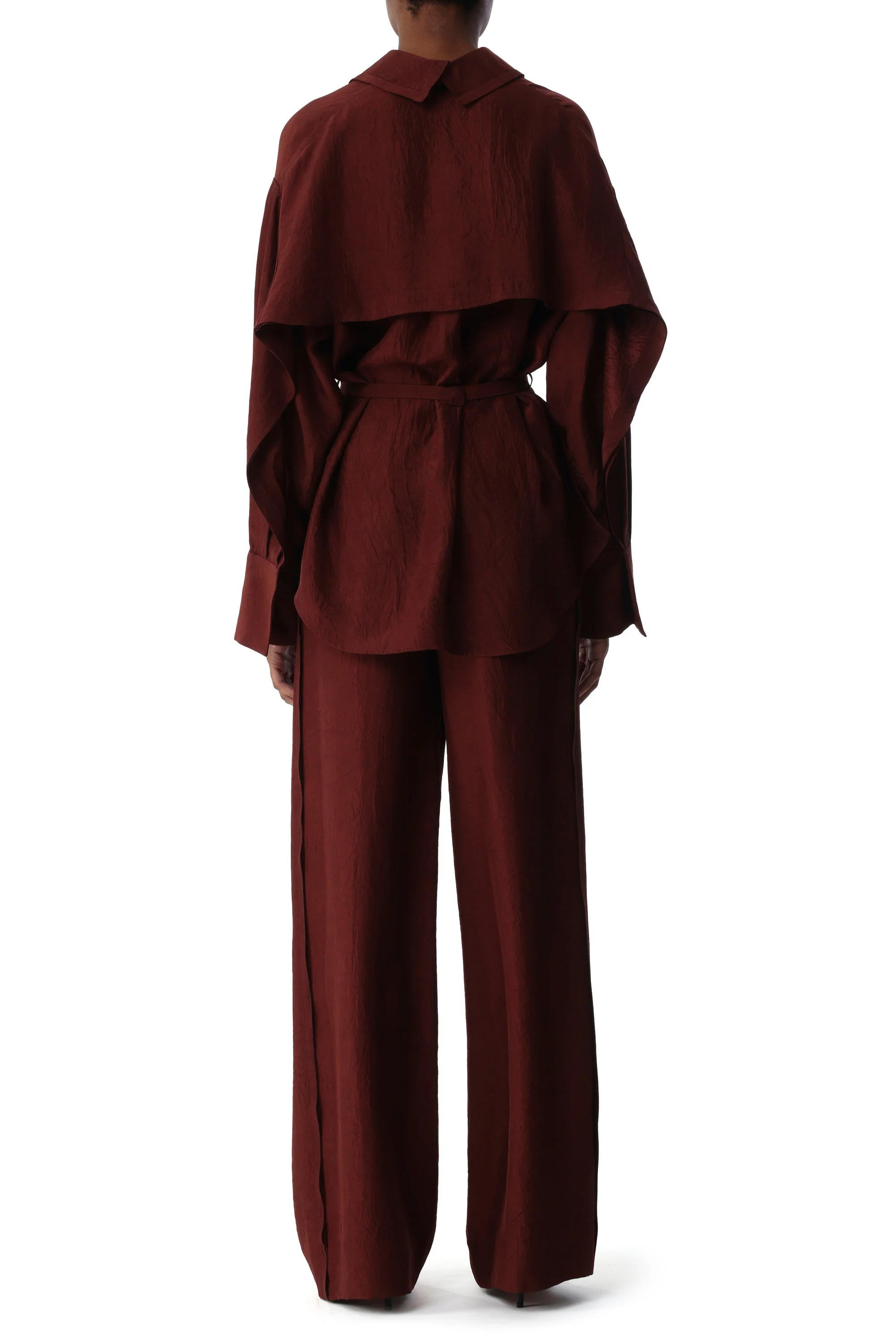Cut from crinkled satin with a soft sheen, this oversized button-up is defined by a waist-cinching self-tie belt. Finished with extended cuffs, a crisp collar, and a sculptural hem, it’s a fluid take on tailored structure.