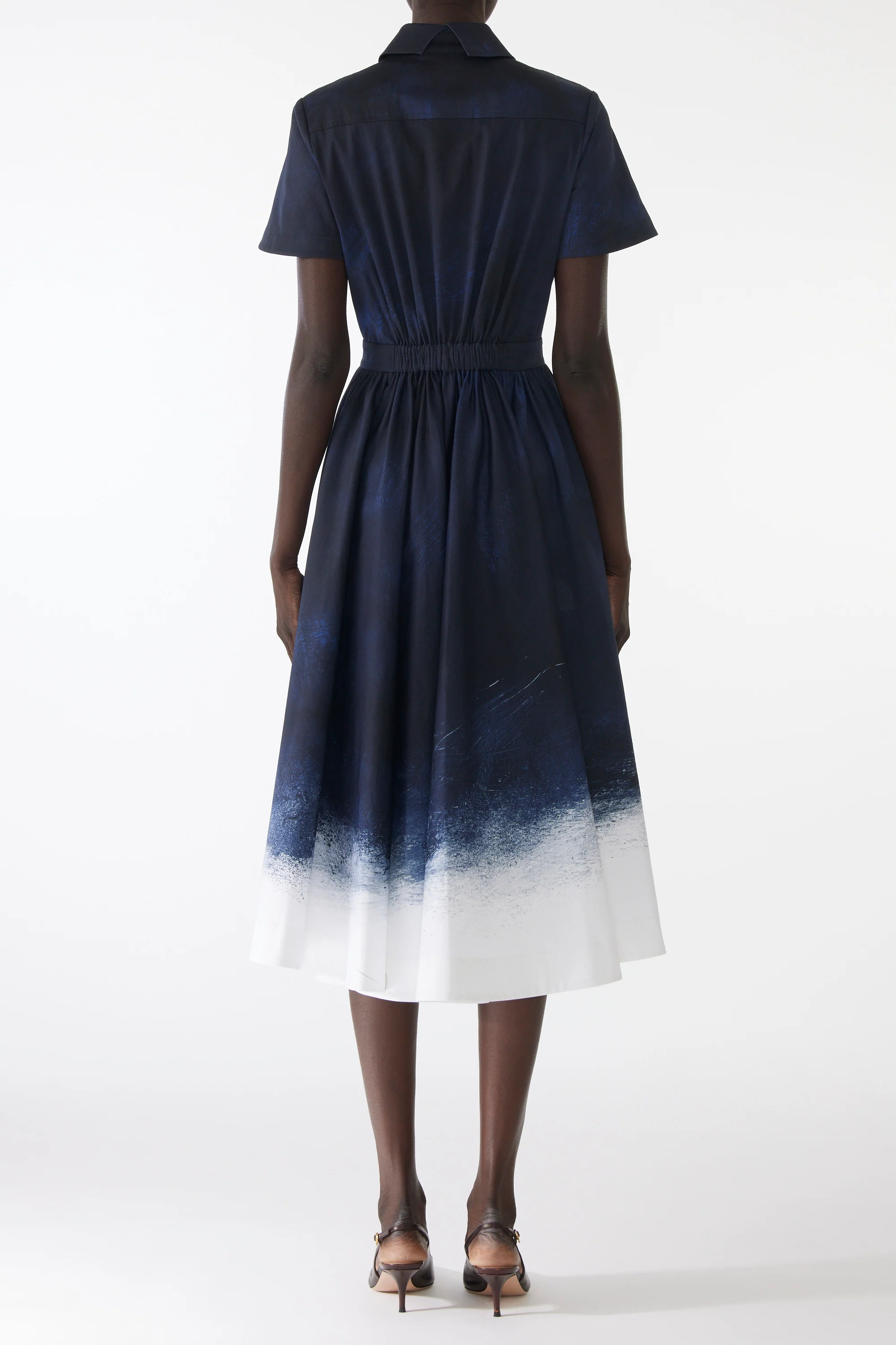 The Brushed Canvas Printed Stretch Cotton Shirtdress brings timeless tailoring and artistic detail into perfect balance. Part of our special cotton capsule, this piece is crafted in soft stretch cotton with a brushed finish for a refined yet relaxed feel. The classic shirtdress silhouette is elevated by a painterly navy-and-white smudged print—offering a fresh, expressive take on an everyday icon.