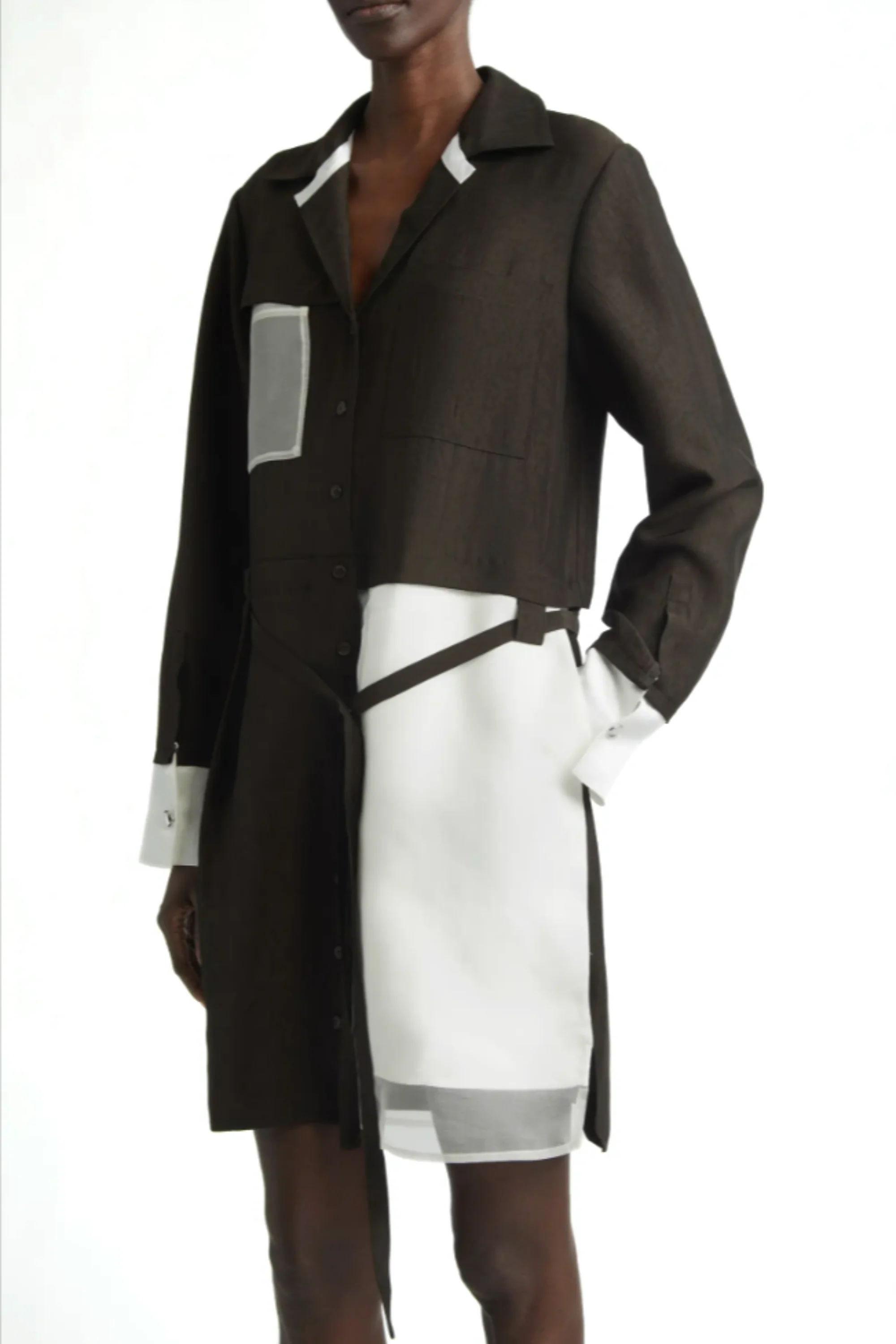 A study in contrast and composition, this shirt dress blends soft suiting with collage-style white organza paneling. Fluid and sculptural, its design guides the eye across each thoughtfully constructed detail.